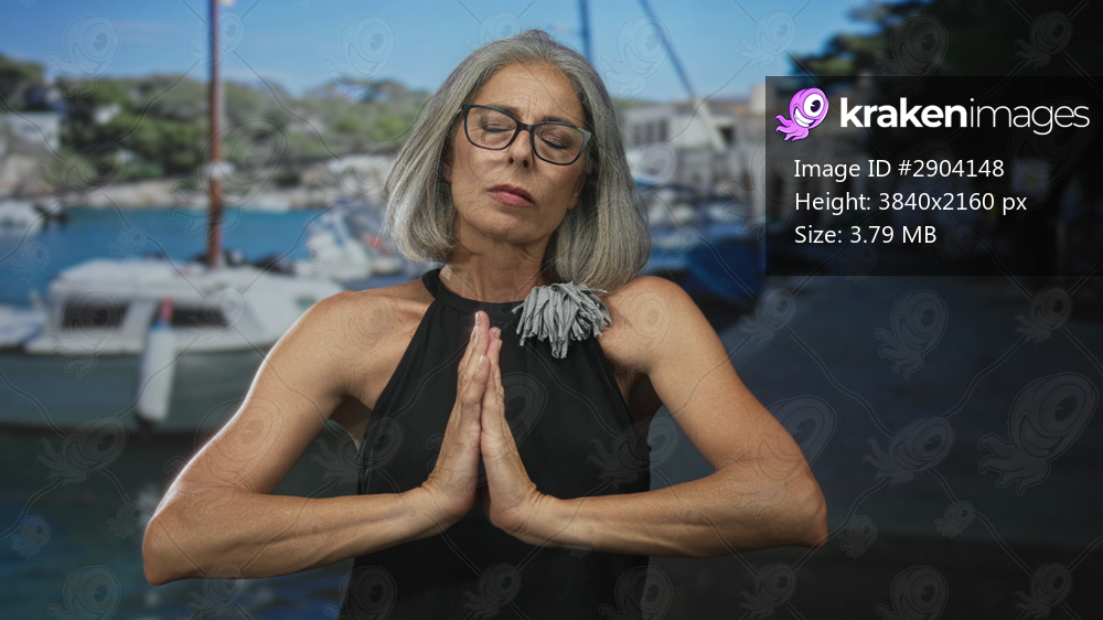Woman with grey hair and glasses, hands pressed together in prayer, eyes closed on a seaside street; serenity.