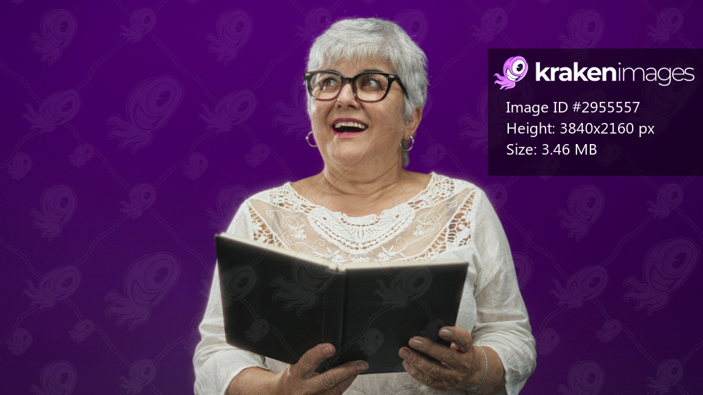 Woman with grey hair and glasses holding a book, smiling and looking up while reading in studio; joy reflection memory.