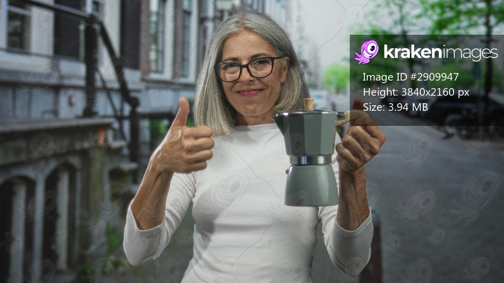 Woman with grey hair and glasses holding a coffeemaker by its wooden handle and giving thumbs up on a city street; coffee morning contentment.