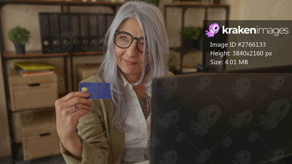 Woman with grey hair and glasses holding credit card at office desk smiling while using computer showing an active senior professional working indoors. - Kraken Images
