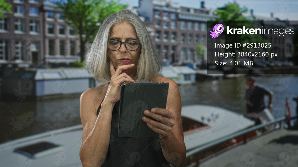 Woman with grey hair and glasses holding tablet, finger on chin, standing on a street by an amsterdam canal with moored boat; thoughtful curiosity reflection. - Kraken Images