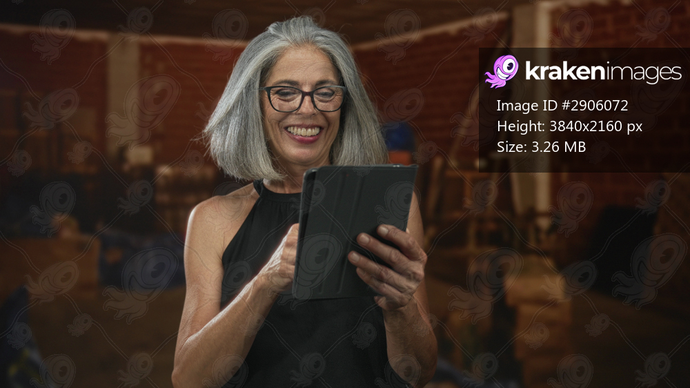 Woman with grey hair and glasses holding tablet and tapping screen while smiling in a building construction site interior; productivity contentment.