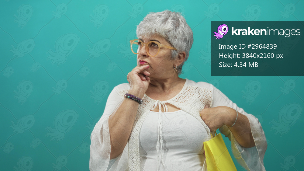 Woman with grey hair and glasses holding yellow shopping bag, finger to chin in studio; thoughtful reflection.
