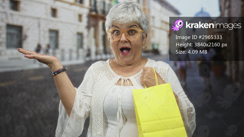 Woman with grey hair and glasses holding yellow shopping bag and showing palm up hand while smiling on a cobbled street with buildings and pedestrians; joyful discovery. - Kraken Images