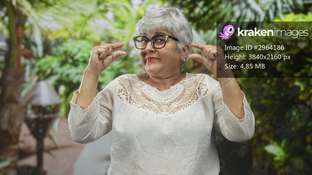 Woman with grey hair and glasses in white lace blouse pinching fingers to show small size in studio; skeptical comparison.