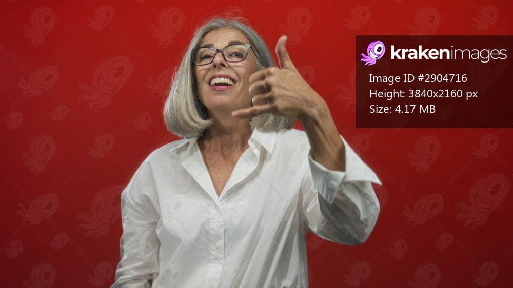 Woman with grey hair and glasses in white shirt counting on fingers while pointing thumb in studio against a red wall; joy curiosity.