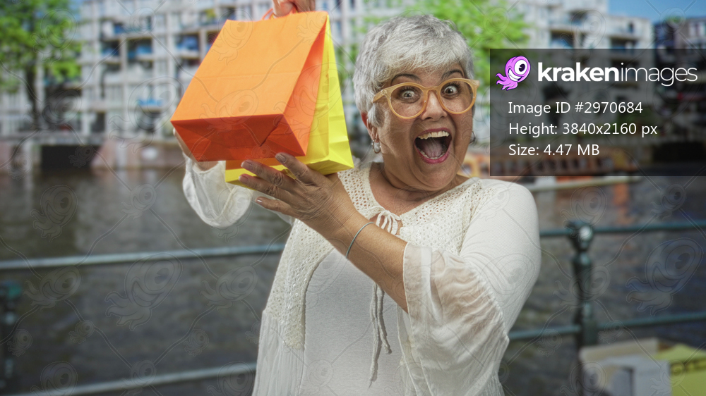 Woman with grey hair and glasses, plus size senior smiling, holding orange shopping bag and giving thumbs up by canal railing near apartment building and tour boat; happiness confidence leisure. - Kraken Images