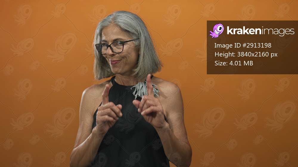 Woman with grey hair and glasses pointing both index fingers toward camera in studio orange backdrop wearing sleeveless black halter; playful confidence. - Kraken Images