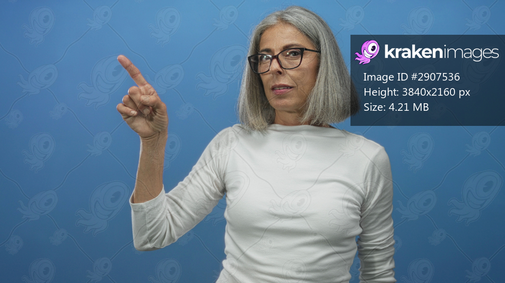 Woman with grey hair and glasses points finger in studio against a blue backdrop wearing white shirt; confidence.