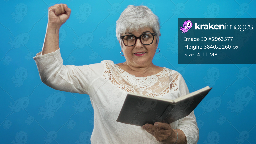 Woman with grey hair and glasses raises fist while holding an open book and reading in studio; empowerment focus.