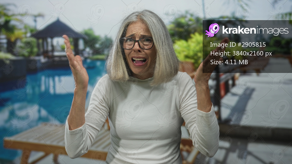 Woman with grey hair and glasses raises hands palms up beside a resort pool and wooden loungers near a hotel building, grimacing; frustration.