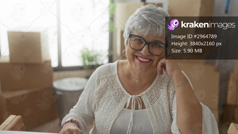 Woman with grey hair and glasses resting hand on cheek beside stacked cardboard moving boxes at a table inside a building; settling contentment.