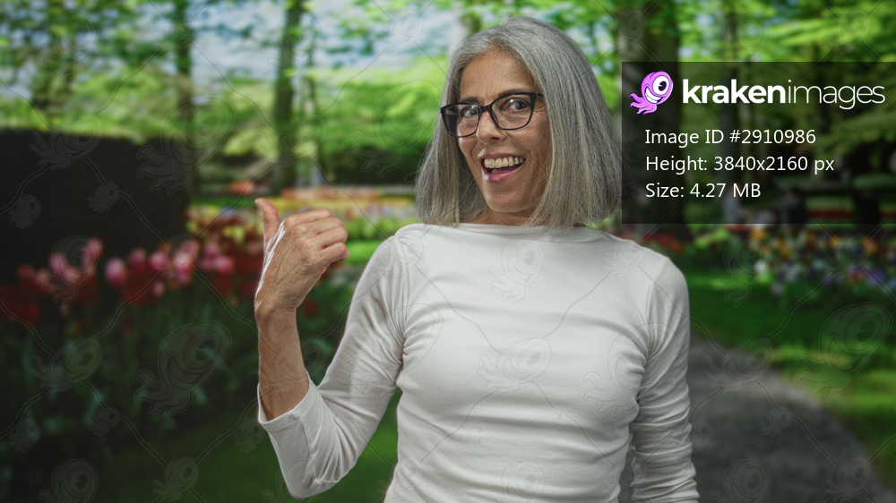 Woman with grey hair and glasses smiles and points thumb to forest path in a green park beside tulip beds; cheerful confidence playfulness.