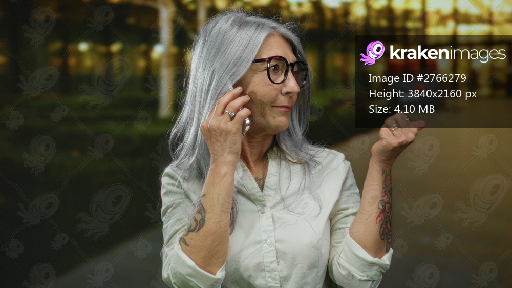 Woman with grey hair and glasses talks on phone outside market while pointing with thumb to the side, wearing a casual white shirt and displaying tattoos on her arms. - Kraken Images