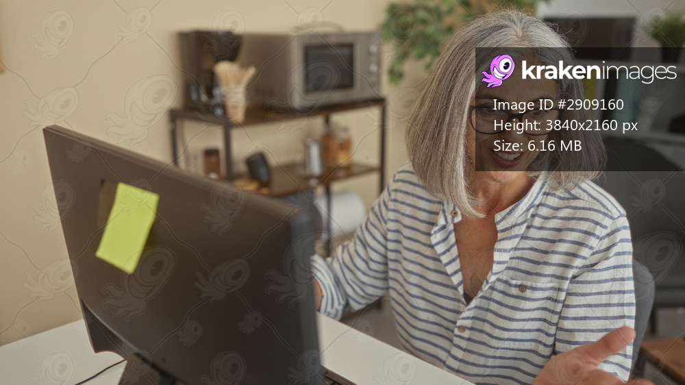 Woman with grey hair and glasses typing on desktop computer at desk in office building, smiling as she looks at the monitor; contentment productivity focus. - Kraken Images