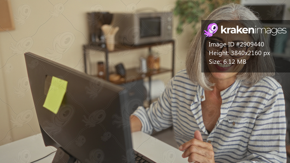 Woman with grey hair and glasses typing on desktop computer at desk in office building, smiling as she looks at the monitor; contentment productivity focus. - Kraken Images