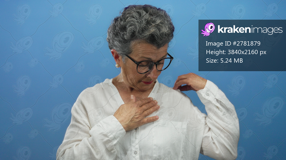 Woman with grey hair and glasses wearing white blouse poses against blue background, showcasing elegance and style in a casual setting with confident demeanor. - Kraken Images
