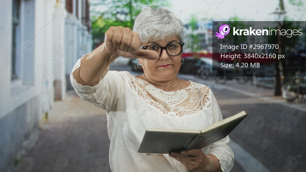 Woman with grey hair holding an open book and showing a thumbs up gesture on a city street with bicycles and canal; encouragement reading.