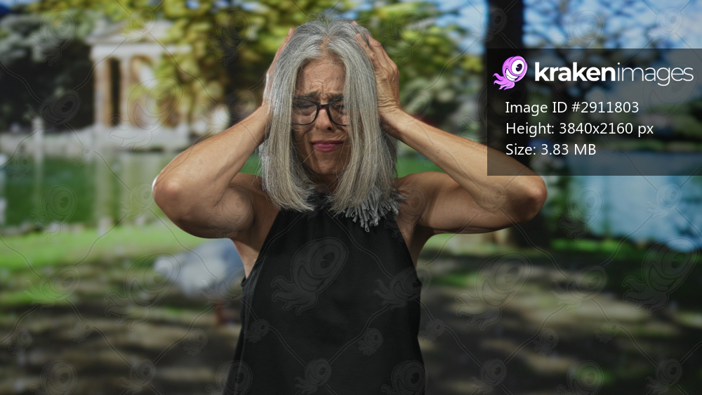 Woman with grey hair holding hands over ears and wincing in a forest near a pond, visible ear cover gesture and sleeveless top; distress tension.