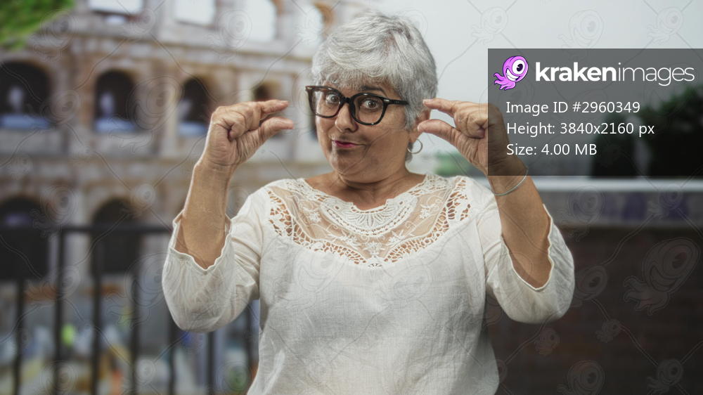 Woman with grey hair holds fingers apart to show small size in front of building, wearing glasses and lace top; playful curiosity memory.
