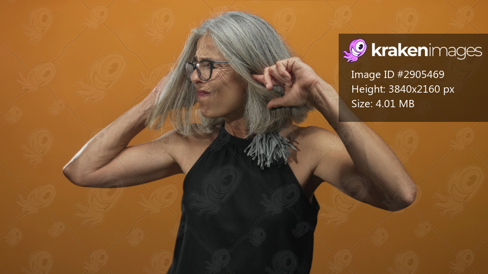 Woman with grey hair in a black sleeveless top holding fingers to ears in studio with orange backdrop; annoyance.