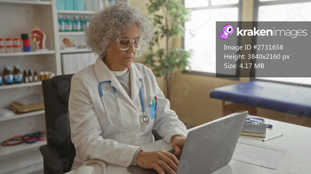 Woman with grey hair in a clinic room removes glasses and looks at laptop, surrounded by a stethoscope and medical supplies on a desk.