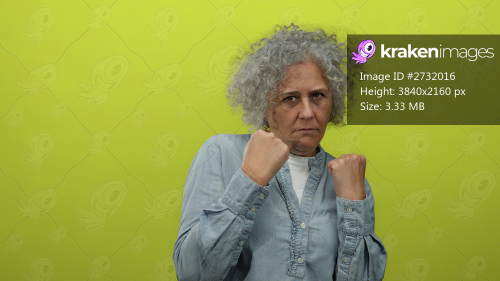 Woman with grey hair in boxing stance against vibrant yellow background embodying strength and determination.
