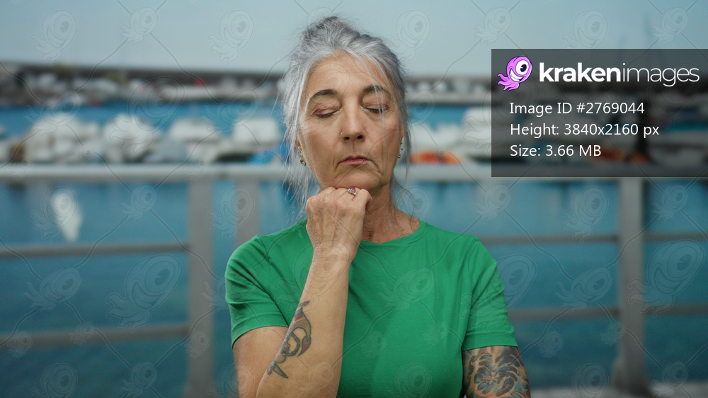 Woman with grey hair in green shirt standing thoughtfully by a seaside port with boats, captured outdoors exhibiting tattoos and serene expression.