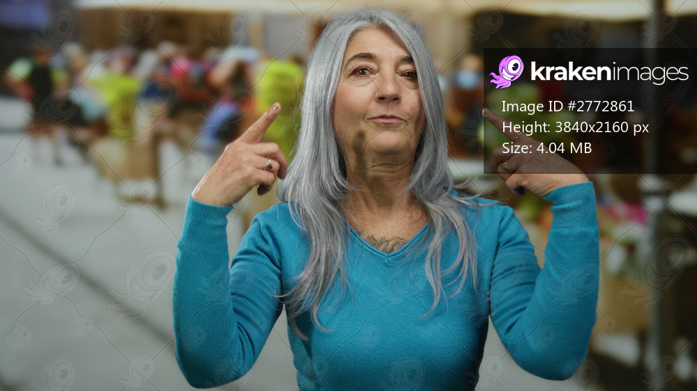 Woman with grey hair in teal shirt gestures on a busy outdoor restaurant terrace with blurred street background, conveying confidence and expression.