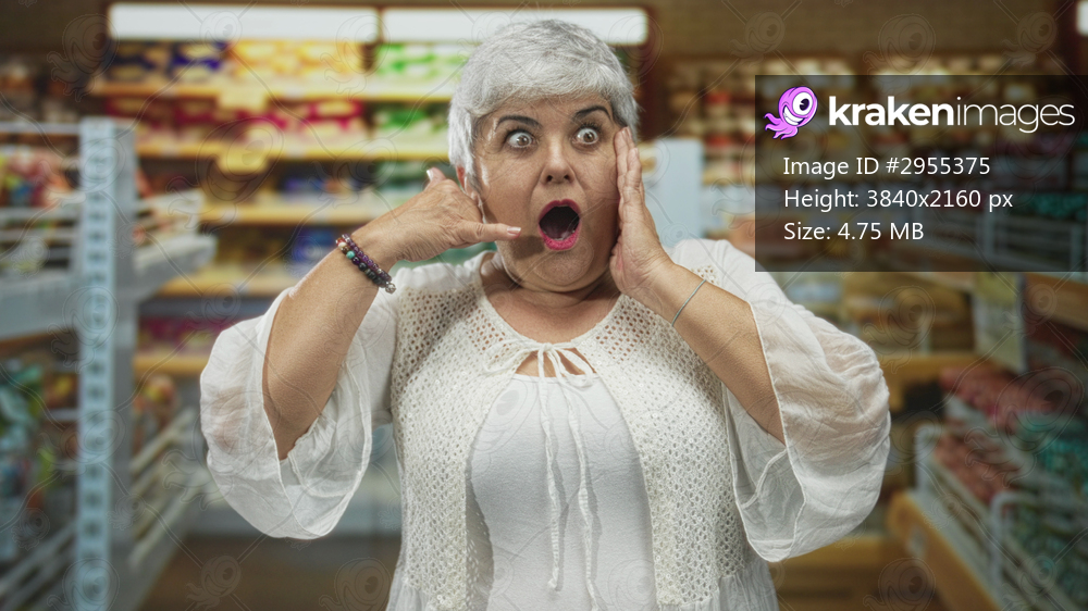 Woman with grey hair making call me hand gesture while holding cheek in supermarket building aisle, smiling then looking shocked across frames; playful surprise. - Kraken Images