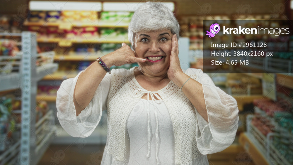 Woman with grey hair making call me hand gesture while holding cheek in supermarket building aisle, smiling then looking shocked across frames; playful surprise. - Kraken Images