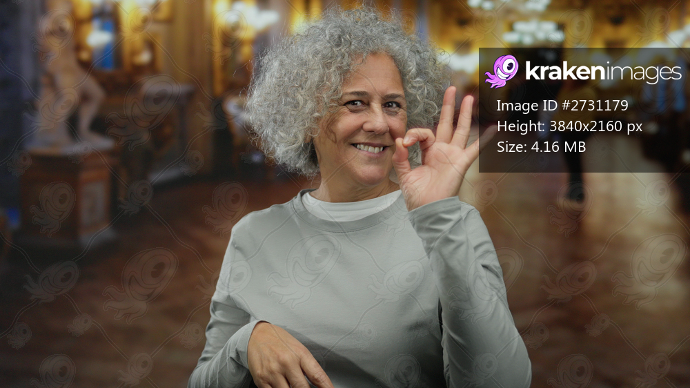 Woman with grey hair making hand gesture in a museum, smiling and signifying positivity in a sophisticated indoor setting.