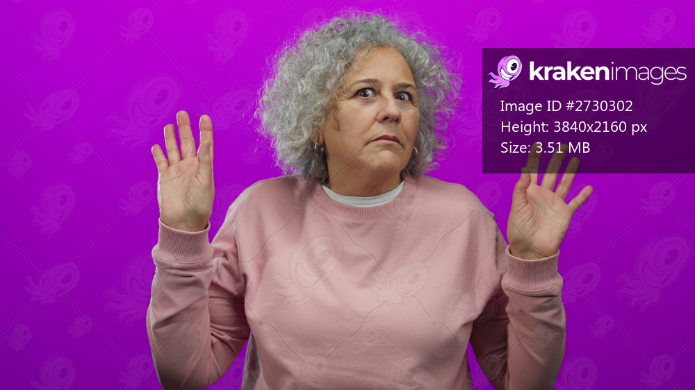 Woman with grey hair and pink sweater gesturing with hands against a vibrant pink wall background expresses confusion or uncertainty.