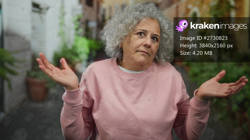 Woman with grey hair and pink sweater standing on an urban street with a calm expression, enhancing the peaceful outdoor atmosphere of the city setting. - Kraken Images