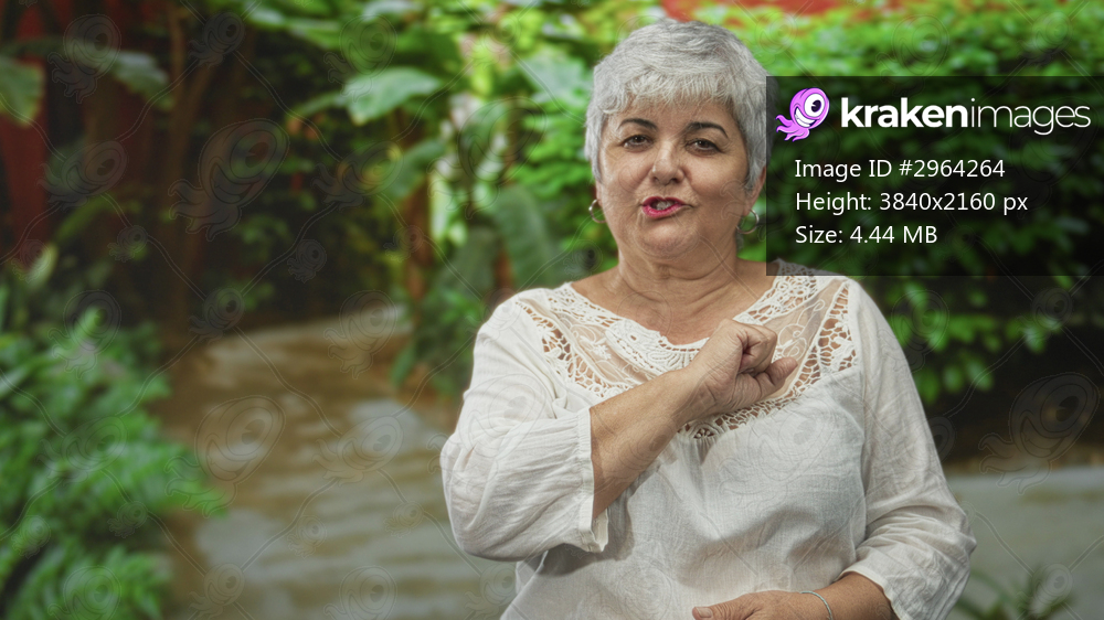 Woman with grey hair places hand to chest while softly speaking in a forest setting; comfort contentment.