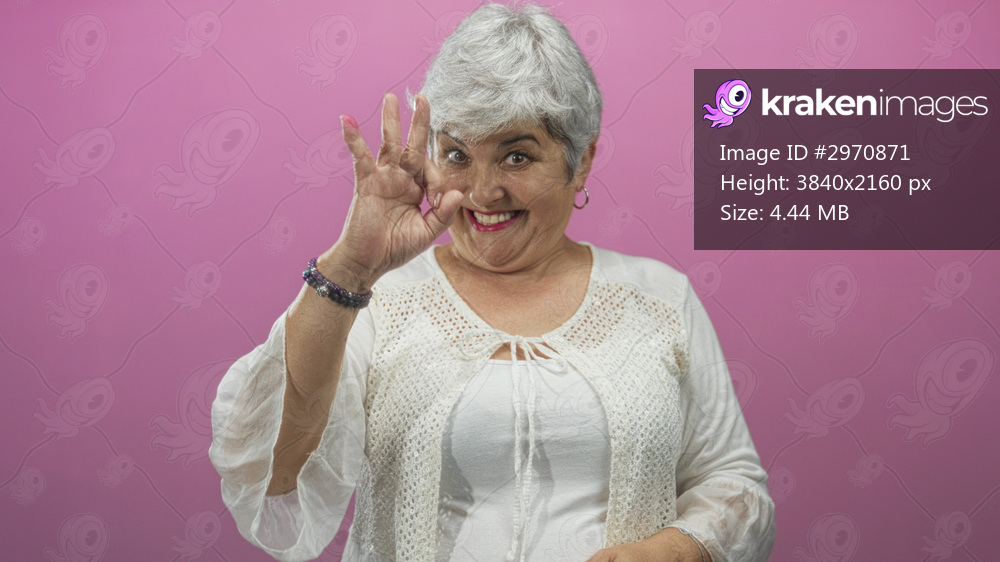 Woman with grey hair pointing index fingers, giving thumbs up and forming a small heart with fingers while smiling against a pink studio backdrop; joy confidence. - Kraken Images