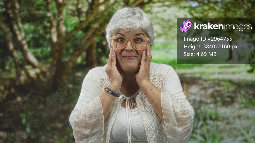 Woman with grey hair pressing hands to cheeks and smiling amid trees in a forest setting; surprise warmth connection.