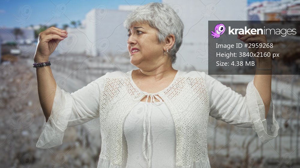 Woman with grey hair raising hands and looking upward beside a ruined building, white knit top visible; frustration release.