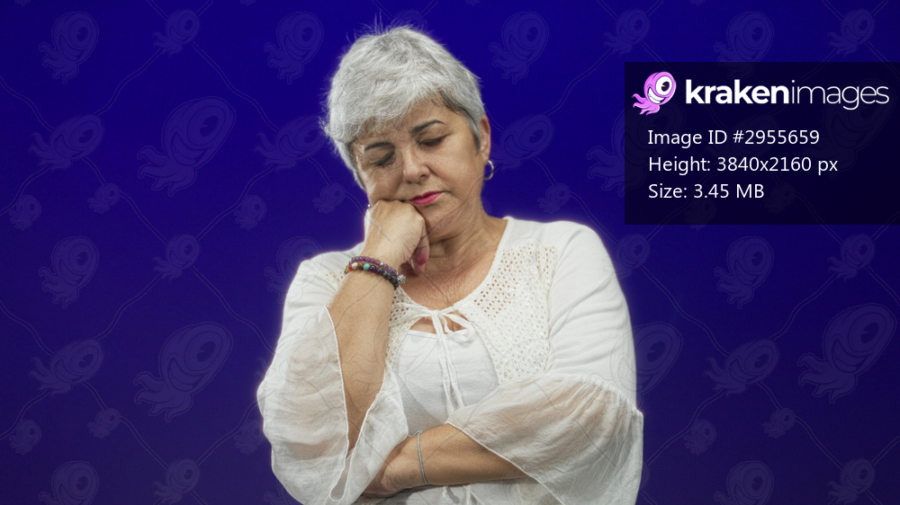 Woman with grey hair resting with hand on cheek, eyes closed and arm crossed, wearing beaded bracelet and white blouse in studio; pensive reflection.