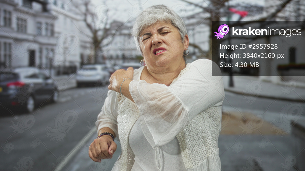 Woman with grey hair rubbing her shoulder and adjusting a sleeve while wearing bracelets on a residential street; discomfort self care.