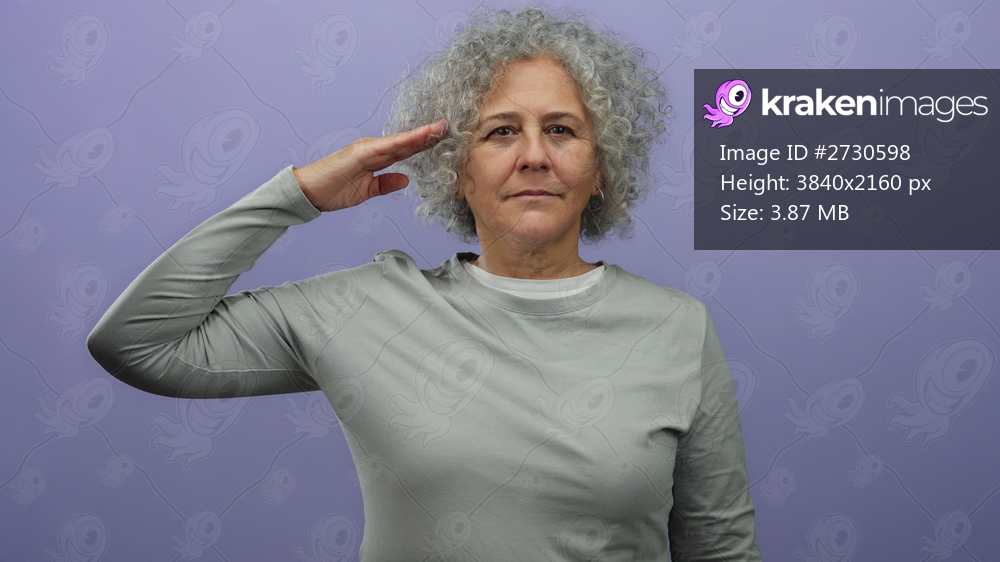 Woman with grey hair saluting against isolated purple wall wearing casual grey attire.