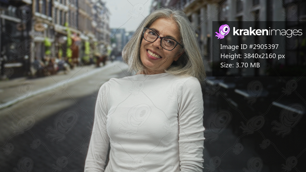 Woman with grey hair smiling, face visible and glasses, wearing white top on a city street; contentment confidence.