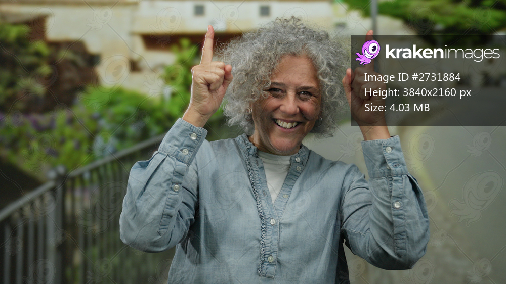 Woman with grey hair smiling and pointing upwards outdoors on a city street with a cheerful expression in an urban environment wearing a blue shirt during daytime. - Kraken Images