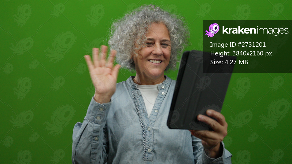 Woman with grey hair smiling and waving during video call with tablet against green background.