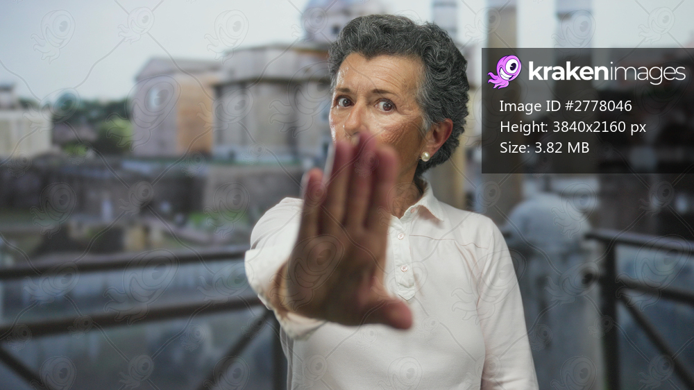 Woman with grey hair standing near roman ruins outdoor extending hand in stop gesture