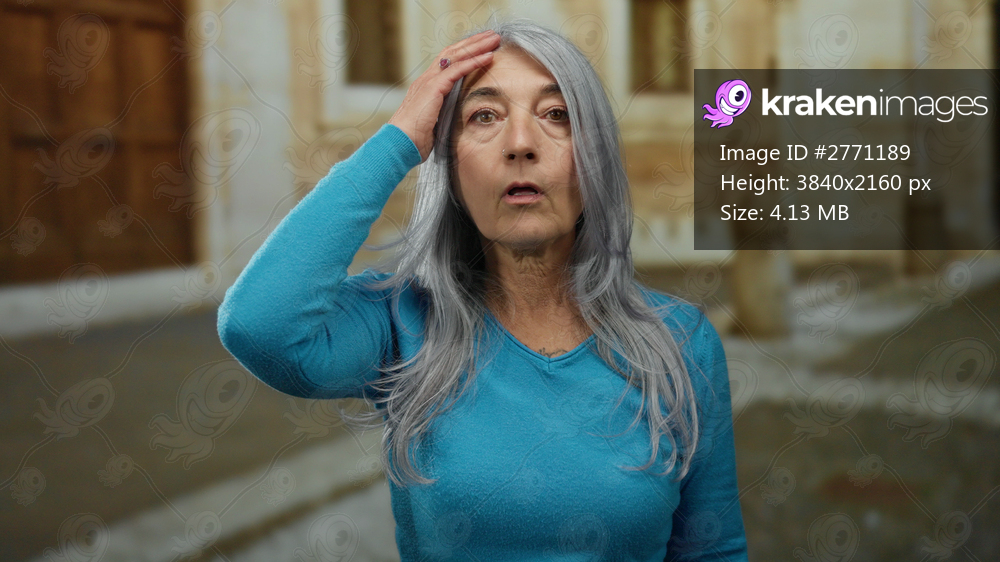 Woman with grey hair standing on street in outdoor setting expresses emotion in casual blue sweater near stone building reflecting concern with hand on head. - Kraken Images