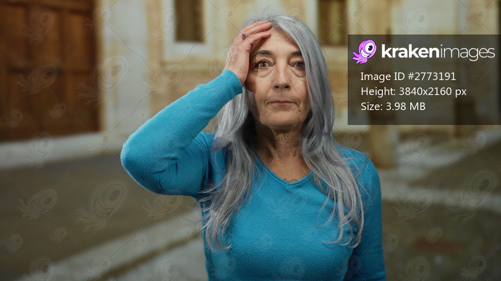 Woman with grey hair standing on street in outdoor setting expresses emotion in casual blue sweater near stone building reflecting concern with hand on head. - Kraken Images