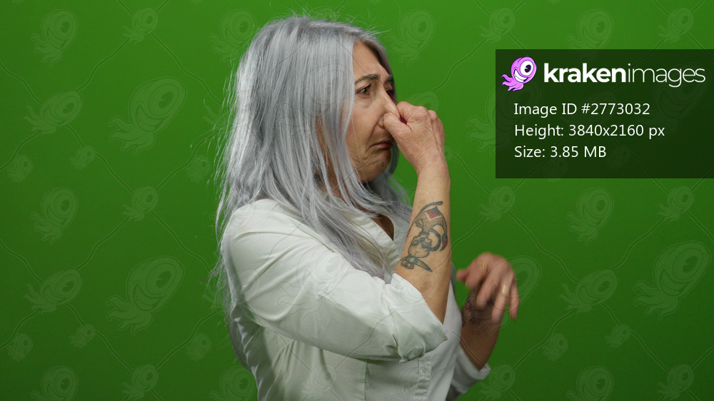 Woman with grey hair and tattoos covering her nose on an isolated green background, expressing disgust or bad smell.