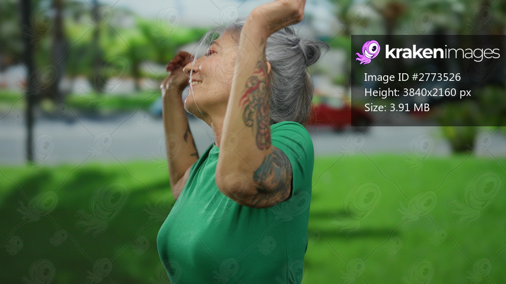 Woman with grey hair and tattoos enjoys a sunny day outdoors, gracefully posing with arms raised in a vibrant green park setting.