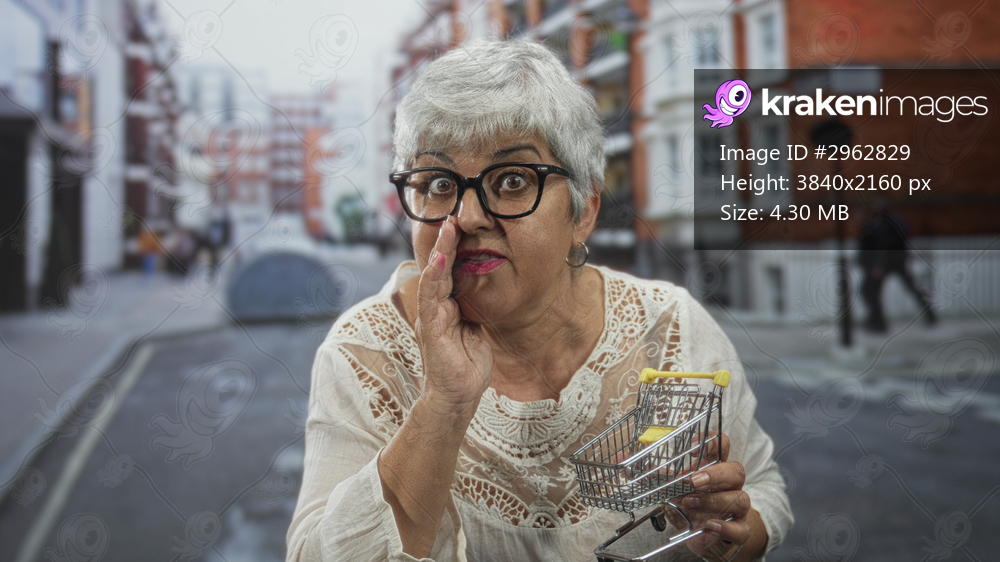Woman with grey hair wearing glasses and a lace blouse holding a miniature shopping cart while cupping hand to mouth on a street; surprise curiosity.